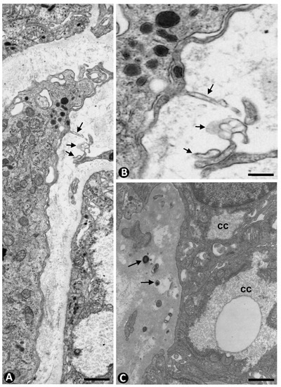 (A) Extracellular vesicles (arrows) are observed in the vicinity of telocytes and cells with secretory granules in hyperplastic parathyroids. (B) corresponds to the area of extracellular vesicles in (A) at higher magnification. (C) Dense bodies (arrows) in the stroma underlying clear cells (cc) of hyperplastic parathyroid. Ultrathin sections. Uranyl acetate and lead citrate. Scale bars: (A,C) 2 µm, (B) 1 µm.