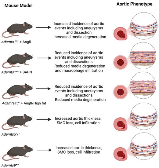 - Wang, S.; Liu, Y.; Zhao, G.; He, L.; Fu, Y.; Yu, C.; Wang, Z.; Zhao, T.; Cao, F.; Gao, Y.; et al. Postnatal deficiency of ADAMTS1 ameliorates thoracic aortic aneurysm and dissection in mice. Exp. Physiol. 2018, 103, 1717–1731. [Google Scholar] [CrossRef] [PubMed]