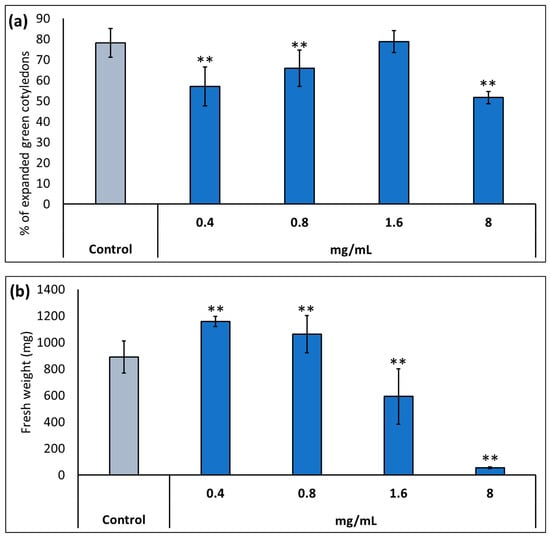 Determination of the optimal dose of potassium humate (KH60) in two stages of A. thaliana development: (a) complete expansion of the green cotyledons and (b) vegetative growth. In the case of vegetative growth, the application of KH60 was carried out 3 days after the transplant, and fresh weight was measured when the plants showed a fully developed rosette stage. The X-axis indicates the different concentrations (0.4, 0.8, 1.6, and 8 mg/mL) of the KH60, while the Y-axis represents (a) the percentage of expanded green cotyledons and (b) the fresh weight (mg) of plants grown to full rosette. n = 30 for each individual bar. Bars represent the standard error. ** p < 0.01 by Student’s tests for the target sample compared to the control sample.