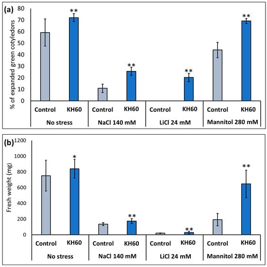 After determining the optimal concentration, the effect of KH60 was studied under stress conditions. We investigated salt stress (140 mM NaCl or 24 mM LiCl) and osmotic stress (280 mM mannitol). The rationale behind using LiCl is that it is a widely used analog of sodium, but it is toxic at lower concentrations (about 5–6 times lower concentrations); thus, it causes less osmotic stress [25]. Mannitol was used to simulate drought stress as it is an osmophilic molecule that does not enter the plant, but it compromises root water uptake [38]. The presence of KH60 in the medium induced a marked increase in expanded green cotyledons and biomass during vegetative growth under control and under abiotic stress conditions when compared to the control plants under stress (Figure 2). This stimulating effect was especially dramatic for fully opened cotyledons under LiCl stress (1923%) (Figure 2a) and in vegetative growth in the presence of mannitol (239% increase), in this latter case, the plants had a % of expanded green cotyledons and fresh weight similar to an unstressed plant (Figure 2b).