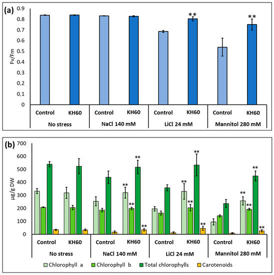 We determined the effect of KH60 on the quantum yield of photosystem II and the photosynthetic pigments in Arabidopsis plants at the stage of full rosette development. Under control conditions, KH60 had no effect on any of the assayed parameters. At 24 mM LiCl and at 280 mM mannitol, KH60 was able to maintain the levels similarly to unstressed plants while in the untreated samples, the levels dropped about 20–40% (Figure 3a). The concentrations of chlorophyll a, chlorophyll b, and carotenoids also were maintained at levels in the same range as unstressed plants upon KH60 treatments and under all abiotic stress conditions assayed, especially in the case of LiCl and mannitol (Figure 3b).