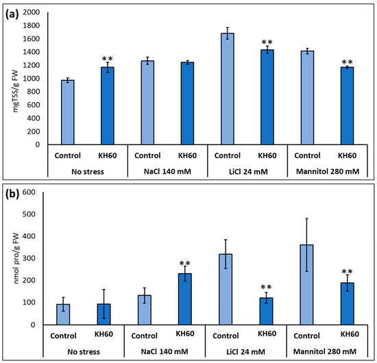 Accumulation of osmolytes under abiotic stress. (a) Total soluble sugars (TSS) and (b) proline (pro). The X-axis indicates the different concentrations of abiotic stressors. The Y-axis represents (a) mg TSS per gram of fresh weight (FW) and (b) nmols of proline per gram of fresh weight (FW). n = 6 for each individual bar. Bars represent the standard error. ** p < 0.01 by Student’s tests for the target sample compared to the control sample.