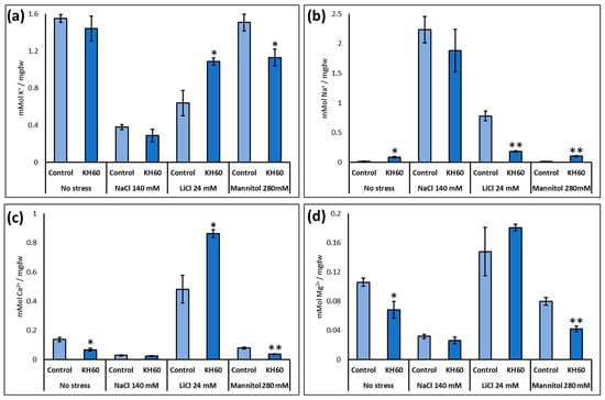 Determination of (a) potassium (b) sodium (c) calcium and (d) magnesium. The X-axis indicates the different concentrations of abiotic stressors. The Y-axis represents the mMol of the indicated ion per milligram of dry weight (mgdw). n = 6 for each individual bar. Bars represent the standard error. * p < 0.05 and ** p < 0.01 by Student’s tests for the target sample compared to the control sample.