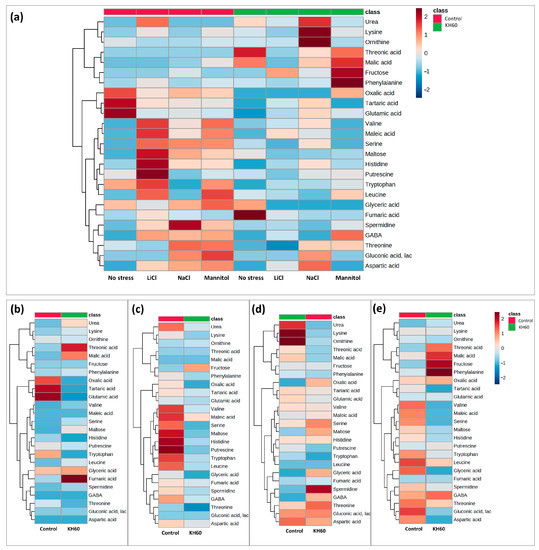 Hierarchical clustering analysis of the correlation between each of the measured A. thaliana metabolites and four tested conditions. (a) Comparative analysis of the accumulation patterns under the four tested conditions (normal, saline (NaCl and LiCl), and osmotic stress (mannitol)) and presence or absence of potassium humate (KH60). Cluster analysis of accumulated metabolites under (b) normal, (c) 24 mM LiCl, (d) 140 mM NaCl, and (e) 280 mM mannitol conditions. Different color scales represent different relative metabolite levels; red indicates up-accumulation and blue indicates down-accumulation of metabolites. n = 4 for each condition.