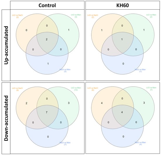 Venn diagrams of common and unique metabolites between common significantly differentially accumulated metabolites after comparing the different abiotic stress conditions: LiCl vs. NaCl, LiCl vs. Mannitol, and NaCl vs. Mannitol. The Venn diagrams correspond to up-accumulated metabolites under control treatment (upper panel left), up-accumulated metabolites under KH60 treatment (upper panel right), down-accumulated metabolites under control treatment (lower panel left), and down-accumulated metabolites under KH60 treatment (lower panel right). Numers in parenthesis represent the total amount of metabolits per circle.