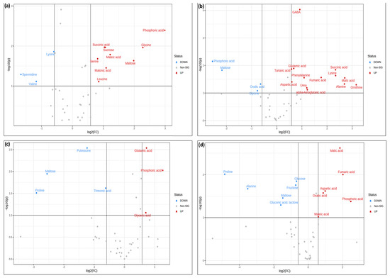 Volcano plot analysis of metabolic changes under (a) normal, (b) 140 mM NaCl, (c) 24 mM LiCl, and (d) 280 mM mannitol conditions. A comparison of the samples containing KH60 with respect to the control samples without potassium humate was made to obtain significantly differentially accumulated metabolites. The X-axis indicates fold change threshold (FC ≥ 1.5), while the Y-axis represented the t-test threshold (p-value ≤ 0.05). Different colors represent different relative metabolite levels; red indicates significant up-accumulation and blue indicates significant down-accumulation of metabolites. Grey points represent metabolites for which no significant changes were observed.