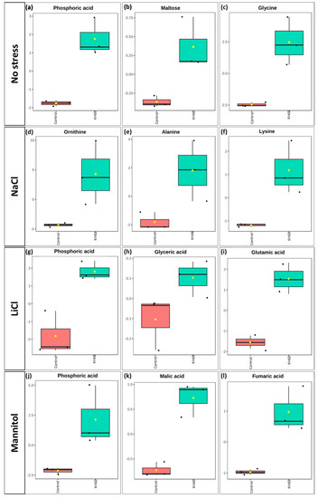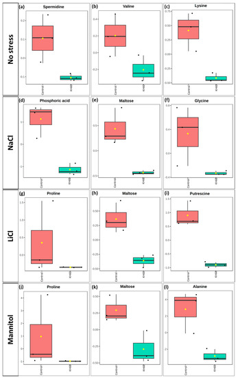 Boxplot of the most significantly down-accumulated metabolites under (a–c) normal, (d–f) 140 mM NaCl, (g–i) 24 mM LiCl, and (j–l) 280 mM mannitol conditions. The X-axis shows the treatment with KH60 next to its control. The Y-axes are represented as relative units. The data were normalized to the total spectral area. Due to this normalization process, a negative scaling on the Y-axis was obtained in some cases. Boxes range from the 25% and 75% percentiles; the 5% and 95% percentiles are indicated as error bars; individual data points are indicated by circles (n = 3). Medians are indicated by horizontal lines inside each box. The mean concentration of each data set is indicated by a yellow diamond.