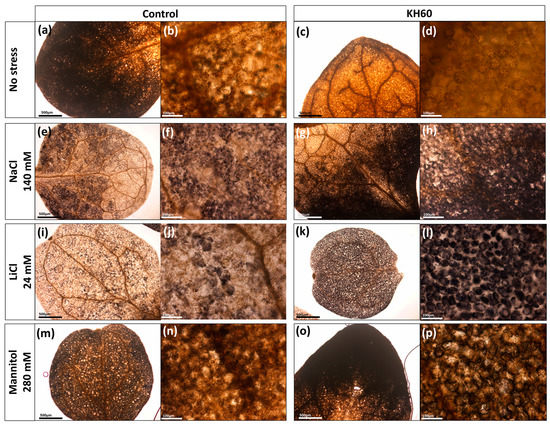 Effect of KH60 on starch accumulation in Arabidopsis leaf cells under (a–d) normal conditions and abiotic stress conditions exerted by (e–h) 140 mM NaCl, (i–l) 24 mM LiCl, and (m–p) mannitol 280 mM. The plants were grown for 10 days under abiotic stress conditions and in the presence of potassium humate KH60 and stained with Lugol, as described in Materials and Methods (c,d,g,h,k,l,o,p). Pictures were taken with a stereoscope (a,c,e,g,i,k,m,o; bar size 500 µm) or with an optical microscope (b,d,f,h,j,l,n,p; bar size 100 µm). The experiment was repeated in 3–5 plants and representative images of a single leaves for each treatment are shown.