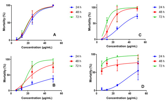 Larvicidal activity for PC (A), nanoemulsion NE1 (B), nanoemulsion NE3 (C) and nanoemulsion NE2 (D) in concentrations of 6.25–50 μg/mL.