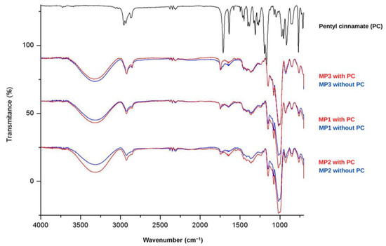 FTIR spectrum of pentyl cinnamate (PC) and MP1, MP2 and MP3 microparticles.