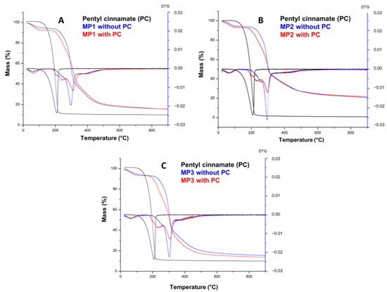 TG/DTG curves of pentyl cinnamate (PC) and solid microparticles MP1 (A), MP2, (B) and MP3 (C).