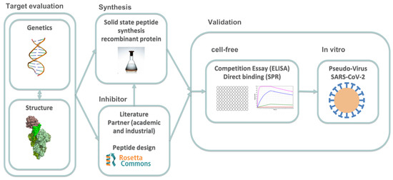 Flow chart of the drug discovery pipeline for designing and testing peptides inhibiting the SARS-CoV-2 infectivity. The pipeline involves target evaluation, inhibitor identification, and peptide synthesis, followed by cell-free and in vitro compound validation. Inhibitors can be designed using in silico tools or from the literature or external partners. Promising compounds are identified through ELISA and SPR assays before undergoing pseudovirus entry assay validation. This pipeline allows for the rapid identification of potential drug candidates for COVID-19.