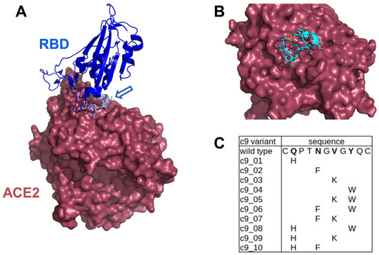 Due to its critical role in viral entry, the S-protein/ACE2 interaction is a primary therapeutic target for treating SARS-CoV-2 infections [12]. Various approaches have been developed, such as engineered ACE2 mimetics or decoy receptors [13], de novo-designed mini proteins [14], macrocyclic peptides [15,16], and synthetic peptide libraries [17] that are capable of binding to the SARS-CoV-2 spike RBD. Another strategy is the development of anti-ACE2 inhibitors to block the interaction between RBD and ACE2 [18]. However, since ACE2 has essential functions in the body, anti-ACE2 inhibitors should not interfere with its physiological processes. A small and highly specific inhibitor, such as a small peptide, would be an ideal solution to block SARS-CoV-2 infection. Peptides are cost-effective, easy to develop, and have a lower risk of toxicity and side effects than other drug classes. Macrocyclic peptides have been shown to be effective in disrupting protein–protein interactions [19,20,21], specifically where a defined binding pocket is missing, such as in the ACE2-RBD interaction [22].