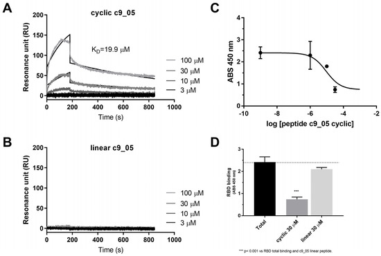 Direct binding and inhibitory effect of cyclic peptide c9_05. Binding signal of (A) cyclic and (B) linear c9_05 to ACE2 as measured by SPR, with a sensorgram for four different c9_05 concentrations (3, 10, 30, and 100 μM) and fitting results displayed in black. (C) Concentration-dependent reduction in binding of RBD when ACE2 was preincubated with cyclic c9_05 at different concentrations (10, 30, 100 µM), as measured by ELISA competition assay. (D) Binding reduction in RBD to ACE2 when 30 μM of cyclic or linear c9_05 are present in the ELISA competition assay. *** p < 0.001.
