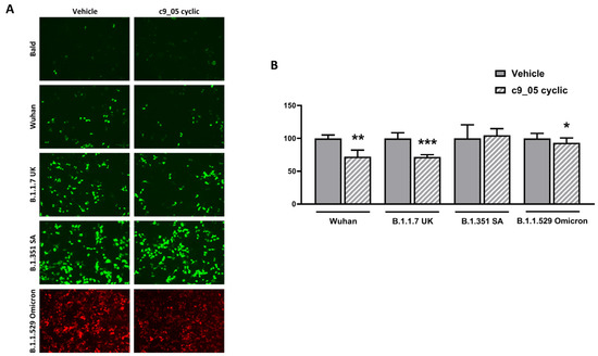 The treatment with cyclic c9_05 reduced pseudoviral transduction. (A) Representative fluorescence microscopy images and (B) percentage of GFP (green) or RFP (red)-transduced HEK293-ACE2 cells pre-incubated with 25 µM c9_05 cyclic peptide in water and then transduced with the pseudoviral particles exposing different SARS-CoV-2 spike isoforms or with pseudoviral particles without (bald). Cells were pre-incubated in the same experimental conditions, with an equivalent volume of Milli-Q water as a negative control (Vehicle). Cells were also pre-incubated with 25 µM c9_05 cyclic peptide in water but not transduced (c9_05 cyclic). (A) Scale bar, 100 µM. (B) Data are the mean ± SD of GFP-positive HEK293-ACE2 compared to control cells incubated with vehicle only. * p < 0.05, ** p < 0.01 and *** p < 0.001 vs. vehicle according to unpaired t-test.