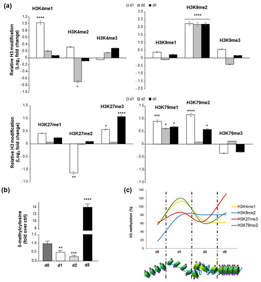 We have previously demonstrated the ability of human neuroblastoma SH-SY5Y cells to differentiate directly into osteoblasts, already after 5 days [28]. To evaluate the epigenetic impact on this process, the genome-wide distribution of specific H3 modifications (including fifteen different H3 methylation states, four H3 acetylation, and two H3 phosphorylation) at 1, 2, and 5 days was determined [9]. As shown in Figure 1a and Figure S1, differentiation was accompanied by changes in histone H3 modifications, including key lysine residues, generally involved, during differentiation, in transcriptionally active (i.e., H3K4, H3K36, and H3K79) and repressed (i.e., H3K9 and H3K27) chromatin states. As revealed by an ELISA assay, at day 1, we found a significant upregulation of H3K4me1, H3K79me1/2, H3K9me2, and HeK27me3 (Figure 1a and Figure S1b) methylation, as well as of H3K36me3 methylation, H3K56 acetylation, and H3S28 phosphorylation (Figure S1), while there was a significant downregulation of H3K27me2 levels (Figure 1a and Figure S1b). High levels of H3K9me2, H3K79me1, and H3K56ac were persistent up to day 5, when the differentiation process was well established (Figure 1a and Figure S1). Conversely, H3K27me3 and H3K79me2, after being downregulated at day 2, returned to high levels at day 5 (Figure 1a and Figure S1b). Our results demonstrate that cancer cell osteogenic differentiation is characterized by specific H3 mark changes. Some lysine modifications, such as those involving K27 and K9, are closely related to the methylation state of DNA. Therefore, we tried to correlate wide-genome H3 modification data with the cell chromatin state, by analyzing global DNA methylation during differentiation. When compared to control cells (day 0), 5-methylcytosine levels dropped out within 2 days of osteogenic differentiation, and then markedly increased by day 5 (Figure 1b). Notably, DNA methylation changes strongly mirrored the H3 modifications described above (Figure 1c). Collectively, these data point out that the process of chromatin opening/remodeling (as evidenced by increased levels of H3K4me1 and H3K79me1/2; Figure 1c) and its consequent increase in transcriptional activity (as evidenced by increased levels of H3K36me3, H3K56ac, and H3S28P; Figure S1c) begin and also end on day 1 of differentiation.