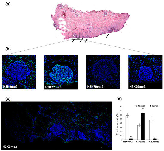 Immunofluorescence analysis of H3 modifications in basalioma. (a) Hematoxylin and eosin staining of biopsy showing basalioma (indicated by black arrows) and surrounding normal tissue (4× magnification). Scale bar: 100 µm. (b) Immunostaining of human basalioma biopsies with specific FITC-conjugated antibodies directed against H3K9me2, H3K27me3, H3K79me2, and H3K79me3. Nuclei were counterstained with DAPI. Each merged image is representative of eight analyzed samples. 20× magnification. Scale bar: 100 µm. (c) Immunostaining with FITC-labeled anti-H3K9me2 antibody. The 4× magnification allows a global view of the entire biopsy. Scale bar: 100 µm. (d) Quantitative analysis of H3K9me2-, H3K27me3-, and H3K79me3-positive nuclei, as derived from immunofluorescence images and calculated by ImageJ/Fiji software 2.9.0. Data are the mean ± S.E.M. and reported as percentage of positive nuclei. ** p = 0.0078 versus normal counterpart.