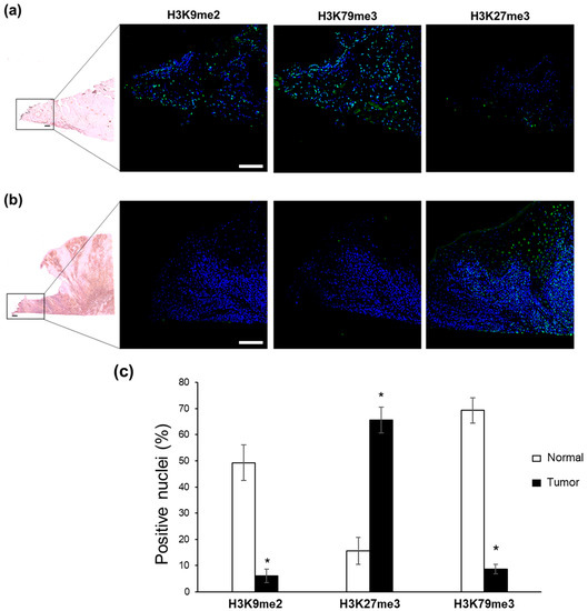 The differential levels of H3 methylation in head and neck cancer samples reflected those observed for basalioma (Figure 3 and Figure S3). Both dimethyl H3K9 and trimethyl H3K79 fluorescent signals were detected in the nuclei of non-tumor head and neck epithelium (Figure 3a), but not in the nuclei of tumor counterparts (Figure 3b); the percentage of positive nuclei was 49.3% and 6.8% (for H3K9me2; p = 0.016), and 69.3% and 4.9% (for H3K79me3; p = 0.016), in normal and tumor regions, respectively (Figure 3c). On the contrary, increased H3K27 trimethylation was evident in all tumor biopsies examined, compared with that observed in related normal specimens (Figure 3a,b), where we found 15.6% of positive nuclei versus 65.6% in tumor ones (p = 0.016).