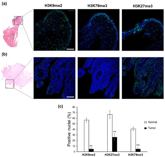 Similar results were obtained in bladder biopsies (Figure 4 and Figure S4), where H3K9me2 and H3K79me3 staining was higher in normal bladder samples (Figure 4a) than in their cancer counterparts, where only a few positive nuclei were detected (Figure 4b); the percentage of positive nuclei was 56.7% and 4.8% (for H3K9me2; p = 0.002), and 40.7% and 4.9% (for H3K79me3; p = 0.002), in normal and tumor biopsies, respectively (Figure 4c). Regarding H3K27me3, positive green nuclei were detected in both normal and cancer regions (Figure 4a,b); the apparent, more pronounced expression in healthy tissues compared with their related tumor sections (66.7% and 25.9% of positive nuclei, respectively; p = 0.002) was, however, not supported by the significant heterogeneity observed among patients (Figure 4c). Overall, our results showed that the low expression of either H3K9me2 or H3K79me3 was markedly associated with tumor phenotype. On the contrary, H3K27me3 expression appeared to be closely related to tumor type.