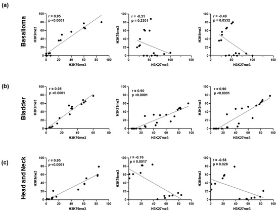 To gain further insights, we evaluated whether the above observed H3 modifications might be statistically correlated with each other. Interestingly, we found a significant positive correlation between H3K9me2 and H3K79me3 epigenetic alterations in all examined tissues (p < 0.0001), with a Pearson correlation coefficient (r) of 0.95 for both basalioma and head and neck cancer and of 0.98 for bladder cancer (Figure 5). Regarding the relationship of H3K27me3 with the other two H3 marks, results varied depending on the tissue examined. A significant positive correlation was found only in bladder cancer (Figure 5b), where, despite the heterogenous expression found across patients, the H3K27me3 mark overall followed the trend of the other two flags. Conversely, we found no statistical significance for basalioma (absence of correlation) and head and neck tumors (apparent negative correlation) (Figure 5a,c).