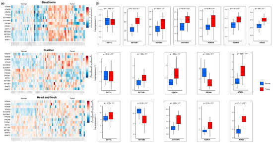 Differential expression gene (DEG) analysis of RNA-seq datasets of normal and tumor samples. (a) Heatmaps illustrating up- and down-regulated K9/K79 modifier enzymes in tumor and normal samples. DEGs are reported as Log2 fold change. Blue to red shows the low- to high-gene-expression trend, respectively. (b) Differential expression of statistically significant single genes involved in chromatin remodeling. Data are reported as Log2 (expression +1). p values are reported in each graph.
