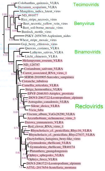 Updated phylogenetic subtree of the beny-like RdRp domains showing a cluster of plant-specific viruses which are significantly related to members of genus Benyvirus. Whole tree was generated using the maximum likelihood method. The bootstrap values obtained with 1000 replicates are indicated on the branches, and branch lengths correspond to the branch line’s genetic distances. Reclovirids are shown in pink.