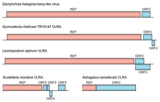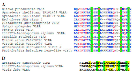Most Reclovirid genomes contain two ORFs, namely, the 5′-terminal long replicase ORF (approximate size of 6300–7000 nucleotides in the nearly full-length genomic RNAs) and the shorter downstream ORF with sizes varying from 330 to 2000 nts [2] (Supplementary Table S1). In some cases, Reclovirid genomes encode two proteins in addition to replicase, and their ORFs often overlap. An exception is Scutellaria montana VLRA, which encodes four small proteins in addition to replicase (Figure 2) (Supplementary Table S1). The gene organization of the 3′-terminal regions in Reclovirid RNAs is rather variable. For example, two highly similar VLRAs found in Gymnadenia rhellicani (family Orchidaceae) (Table 1), which are closely related in the RdRp phylogenetic tree (Figure 1), show different numbers of the 3′-terminal ORFs (Figure 2) (Supplementary Table S1).