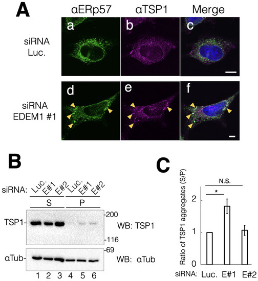 Downregulation of EDEM1 induced intracellular aggregation of TSP1. EDEM1 KD led to the accumulation of the matrix soluble protein TSP1 in cells. (A) After the control or EDEM1#1 siRNA treatment, ER-resident chaperone ERp57 (a,d) and TSP1 (b,e) were immunodetected using corresponding antibodies. Merged images after DAPI staining are also shown (c,f). Co-localization points of ERp57 and TSP1 in EDEM1 KD cells are indicated by yellow triangles (d–f). Scale bars represent 10 µm. (B) siRNA-treated cells were lysed and separated into soluble supernatant (S) and insoluble precipitation (P) fractions. Both TSP1 and αTubulin were detected by western blotting with indicated antibodies for the control (lanes 1 and 4) and EDEM1 KD cells (lanes 2 and 5, 3 and 6). Lane numbers are shown at the bottom of the gel. The molecular weight of marker proteins (kDa) is shown at the right side of the gel. (C) Data in (B) were quantified. αTubulin was used as the cellular loading control. In each sample set (lanes 1 and 4, 2 and 5, 3 and 6, respectively), the values of anti-Flag bands were normalized to those of anti-αTubulin. Notably, the values of soluble bands were normalized to those of precipitation bands. Asterisks refer to the control sample, indicating statistical significance (* p < 0.05; N.S., not significant) according to Student’s t-test. Data represent the mean ± standard deviation of three independent experiments.