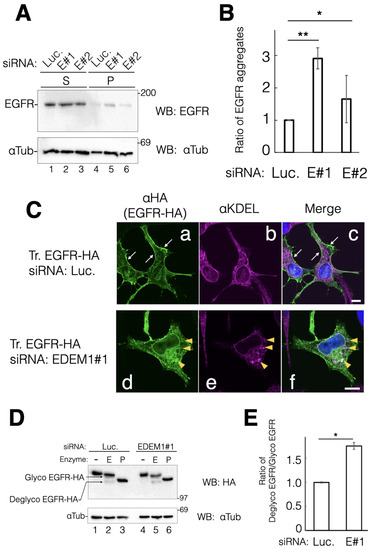 To ascertain whether EDEM1 is involved in EGFR biosynthesis, we constructed hemagglutinin-tagged (HA-tagged) EGFR at the C-term (EGFR-HA). Thereafter, the intracellular trafficking of EGFR-HA during siRNA experiments was examined. Indirect immunostaining with antibodies against HA and KDEL (ER marker) showed that EGFR-HA was localized at the plasma membrane under the negative control siRNA (Figure 4C(a)). This result indicated that exogenously expressed EGFR-HA was properly folded in the ER and transported to the plasma membrane in HeLa cells. However, EGFR-HA was merged with anti-KDEL staining and exhibited some clusters under EDEM1 KD (Figure 4C(d–f)). Furthermore, EGFR-HA was also localized to the nuclear membrane, which is continuous with the ER (Figure 4C(d)). These results suggested that EDEM1 is involved in misfolded EGFR clearance that is retained in the ER by the ERQC. To further confirm the involvement of EDEM1 in the intracellular trafficking of EGFR-HA, we performed endoglycosidase H (Endo H) digestion of the N-glycans of EGFR-HA. Endo H treatment resulted in both slower (Endo H-resistant form) and faster (Endo H-sensitive form) migration of EGFR-HA, representing post-Golgi and ER localization, respectively. Following treatment with the negative control siRNA, markedly higher levels of the Endo H-resistant form of EGFR versus the Endo H-sensitive form were detected (Figure 4D, lane 2). However, KD of EDEM1 increased the levels of Endo H-sensitive EGFR-HA (comparing lanes 2 and 5, Figure 4D). These results suggested that ERAD by EDEM1 clears ER-accumulated EGFR-HA and is important for the proper cellular localization of EGFR-HA.
