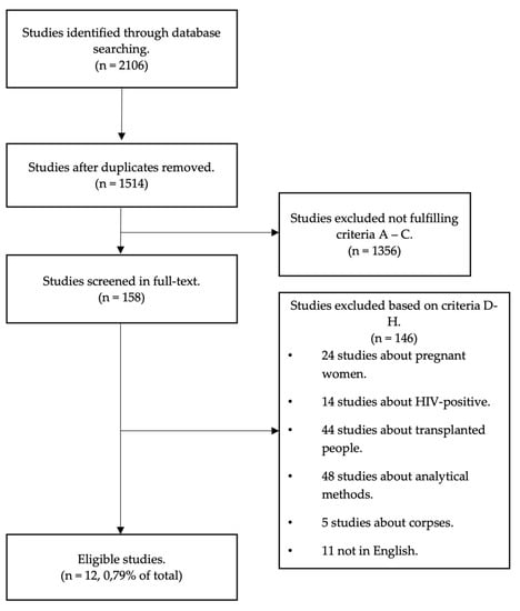 As reported in the PRISMA flow-chart (Figure 1), the combined search on the databases PubMed, Web of Science, and Scopus retrieved 2106 records. Of these, 592 were duplicates and thus were removed, resulting in a total 1514 articles evaluated by title and abstract. From the latter, 1356 were excluded because they did not meet criteria A, B, and C. Of the remaining 158 papers, analyzed in full text, 146 were excluded based on criteria D-H. Twelve papers (0.79% of the total) were included in the present review.