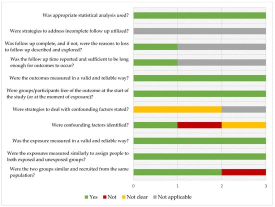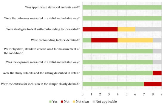 Quality assessment results using the JBI critical appraisal checklist for analytical cross sectional-studies or for cohort studies [25] of the included records are displayed in Figure 2 and Figure 3.