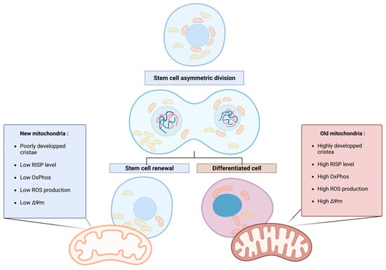 More recently, in 2022, the group of Katajisto pursued the characterization of the so-called “old” and “new” mitochondria and showed that the youngest mitochondria have a typical stem cell metabolism, with few oxidative phosphorylation (OxPhos) activities, low reactive oxygen species (ROS) production, and immature mitochondrial morphology (poorly developed, primitive cristae). Old mitochondria are characterized by a higher level in the electron transport chain (ETC) subunit Rieske iron-sulfur protein (RISP), responsible for the first electron transfer of the complex III. Moreover, a difference in the mitochondrial membrane potential between old and new mitochondria was observed, confirming the difference in OxPhos efficiency [] (Figure 1). In this comprehensive review, the terms “old” and “new” are consistently employed to describe older, mature, and active mitochondria and younger, less active mitochondria, respectively, in accordance with the existing literature.