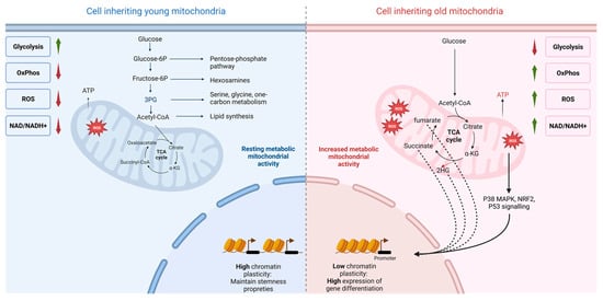 Also, the acetyl CoA is involved in the acetylation of histones by donating its acetyl group to the lysine residue, catalyzed by acetyltransferases (HATs) []. Thus, the level of histone acetylation follows the concentration of acetyl-CoA. By not impeding the electron flow in OxPhos, old mitochondria produce enough reducing power to not saturate TCA. TCA intermediates should thus be more abundant in cells receiving old mitochondria, which is shown experimentally []. As the turnover and utilization of these cofactors and substrates are mediated by the anapleurotic reactions of mitochondrial metabolism, they influence and contribute to histone and DNA epigenetic plasticity and thus to cell fate. DNA hypermethylation, through depletion of the RISP complex characteristic of young mitochondria inheriting cells, could thus repress gene expression involved in progenitor cell differentiation and maintain self-renewal, as it was observed in HSCs (Figure 3) [].