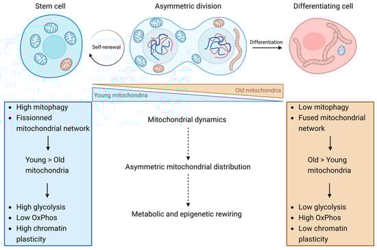The purpose of this review is thus to provide a better understanding of the role played by the mitochondria in stem cell differentiation, with an emphasis on the importance of their asymmetric distribution, the underlying metabolic rewiring, and the resulting epigenetic changes.