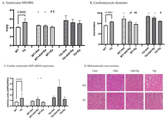 Cardiac hypertrophy morphometric and ANP mRNA expression data. Significance level for the WT vs TG comparison is given; symbols annotate respective comparisons with control (*), ‘+Ald’ (#) and ‘+Ald + Ep’ ($) groups. (A)—ventricular heart weight/body weight; (B)—mean diameters of ventricular cardiomyocytes; (C)—ANP mRNA expression in ventricular heart tissues normalized to GAPDH; (D)—representative microphotographs of midventricular cross sections. At the same magnification (200×), differences in cardiomyocytes’ diameters can be noticed. HE staining.