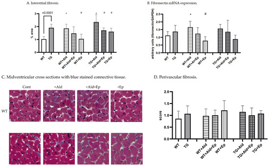 Further, Ep effectively decreased Ald-induced cardiac interstitial fibrosis in the TGF-β1-TG mice, i.e., by 28% (TG + Ald + Ep versus TG + Ald). A similar trend was seen in the WT animals, although it failed to reach statistical significance (Figure 2A). Importantly, the Ep treatment nearly completely abolished the Ald-induced upregulation of the FBN mRNA in both the WT and TGF-β1-TG mice (Figure 2D). These results indicate that Ald-induced cardiac interstitial fibrosis is mainly mediated by the MR and can be effectively attenuated by receptor antagonism.