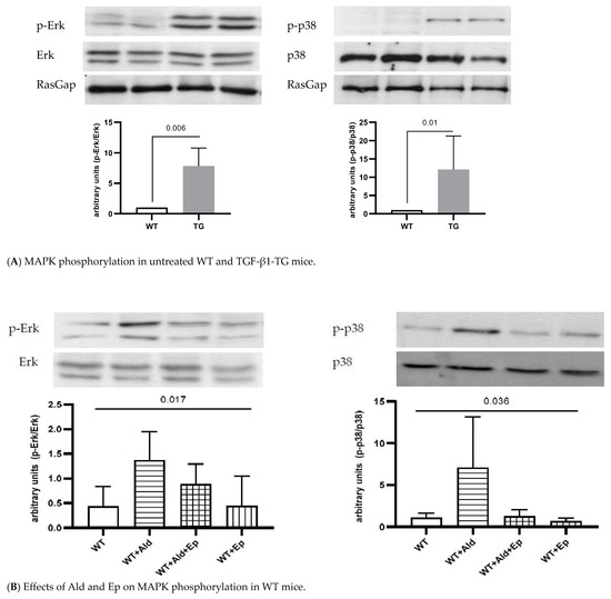 Western blot analysis. Representative Western blot scans of p-Erk and p-p38 of WT and TG animals with total Erk and p38 loading control. (A)—control (untreated) WT and TG animals; (B,C)—untreated, Ald-infused (‘+Ald’), Ald-infused and Ep-treated (‘+Al + Ep) eplerenone-treated (‘+Ep) wild-type (WT) and TGF-β1-transgenic (TG) mice. Four or five separate experiments were performed for each strain. Significance level for ANOVAs on WT mice is given, and post-hoc comparisons between groups were insignificant. . RasGap—Ras GTP activating protein.