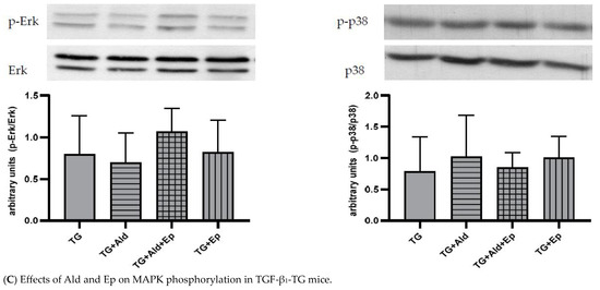 The differential effects on CR can be deduced by comparing the WT and TG strains: in the former, interstitial fibrosis increased significantly more than the cardiac hypertrophy parameters in response to Ald infusion, whereas the change in the morphometric parameters was comparable in the setting of excess TGF-β1 (Figure 4 and Figure 5). Furthermore, the Ep treatment alleviated the profibrotic effect of the Ald infusion in the TG animals, while only a partial reduction was observed for the cardiomyocyte diameter (Figure 5). Concerning the Erk and p38 activation, no significant alterations were observed in the case of the TGF-β1-overexpressing mice across all groups: control, Ald and/or Ep treated, while in the WT animals, MAPKs were stimulated by Ald.