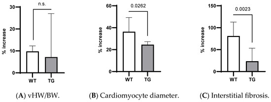 Relative changes in morphometric parameters due to Ald infusion in WT and TG mice: (A) vHW/BW, (B) cardiomyocyte diameter, (C) interstitial fibrosis. n.s.—not significant; TG—TGF-β1 transgenic; vHW/BW—ventricular-heart-weight-to-body-weight ratio; WT—wild type.