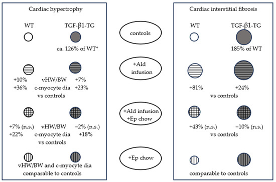 Schematic presentation of morphometric data. Circle diameter for WT controls was used as reference for other WT groups and TGF-β1-TG controls; since two parameters were used for cardiac hypertrophy, the circle diameter reflects an intermediate value between the difference in vHW/BW and cardiomyocyte diameter versus controls. * Mean between difference in vHW/BW and c-myocyte diameter for the TGF-β1-TG vs. WT controls comparison is given. Ald—aldosterone; c-myocyte dia—cardiomyocyte diameter; Ep chow—eplerenone-enriched chow; n.s.—not significant; TGF-β1-TG—TGF-β1-overexpressing transgenic mice; WT—wild-type mice; vHW/BW—ventricular-heart-weight-to-body-weight ratio.