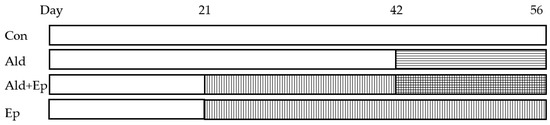 The treatment with Ep started immediately after weaning (at 3 weeks of age) by providing the drug-enriched chow, which lasted 5 weeks (until the age of 8 weeks), while Ald was infused via a minipump between day 42 and 56 (Figure 6).