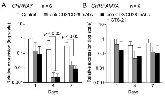 Firstly, the expression levels of CHRNA7 and CHRFAM7A under control conditions and under TCR activation in the presence or absence of GTS-21 over time were normalized by the GAPDH expression. Next, to detect changes over time in the expression levels of CHRNA7 (A) and CHRFAM7A (B) in each individual under control conditions or under TCR activation in the presence or absence of GTS-21, the ratios of GAPDH-normalized CHRNA7 and CHRFAM7A expression levels in each individual were calculated by dividing by respective GAPDH-normalized expression levels found under control conditions on day 1 when frozen/thawed samples had adapted to culture medium [67]. The ratios are shown as relative expression in Figure 2.