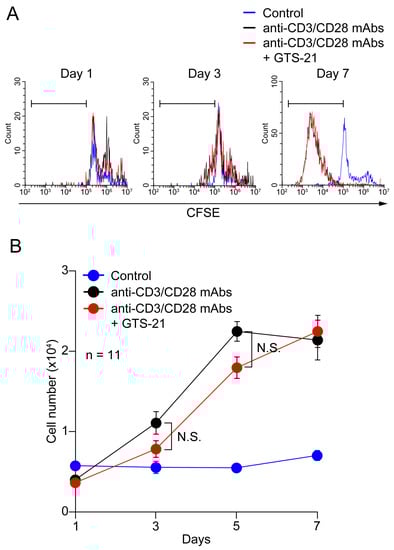 To assess the effect of GTS-21 on cell proliferation, portions of the cells (2 × 104 cells) from 11 samples were cultured for 7 days in duplicate in a 48-well plate containing 200 μL of the standard medium and Human T-activator CD3/CD28 Dynabeads at a beads-to-cell ratio of 1:1. After staining with 4% trypan blue, cell numbers were counted using a Countess II automated cell counter (Thermo Fisher Scientific).