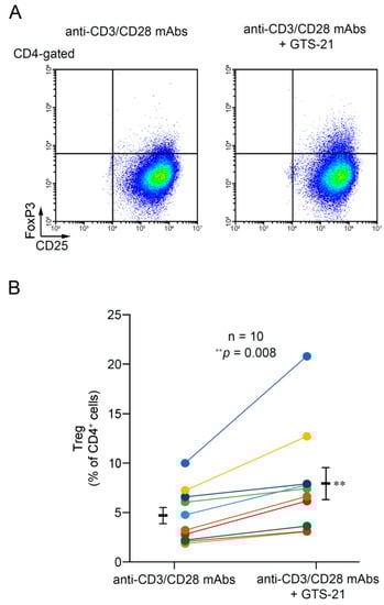 GTS-21 promoted Treg development to varying degrees in samples from all individuals on day 5 of culture in the presence of 20 ng/mL IL-2 and 5 ng/mL transforming growth factor-β (TGF-β). The average number of Tregs was significantly higher in cultures with GTS-21 than without it (p = 0.008) (Figure 4B).