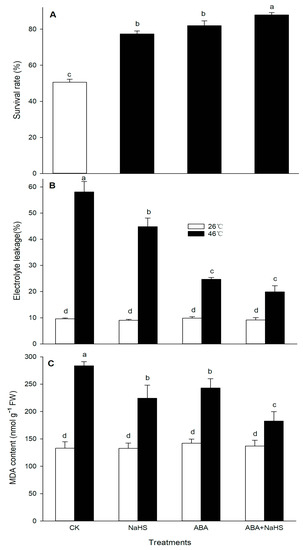 In addition, numerous studies show that H2S and ABA alone or in combination could increase the thermotolerance in plants, but their detailed mechanisms were not completely clear [20,31,32]. In this paper, the thermotolerance in maize seedlings was significantly improved by increasing the survival rate and decreasing the electrolyte leakage and MDA accumulation after the seedlings were irrigated with NaHS and ABA alone or in combination, particularly in combination (Figure 1). Also, Pearson correlation analysis indicated that the survival rate was positively correlated with tissue viability, negatively correlated with electrolyte leakage and MDA accumulation, and their correlation reached a significant difference (Table 2). These results further support the fact that H2S-ABA crosstalk induces thermotolerance in maize seedlings.