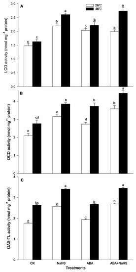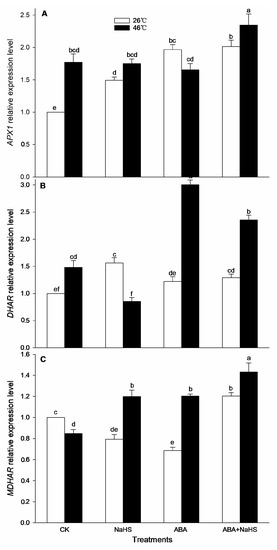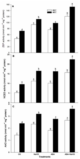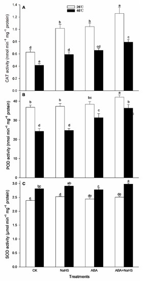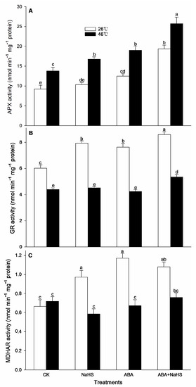 To further understand the mechanism underlying H2S-ABA crosstalk-induced thermotolerance in maize seedlings, after irrigation and HS, the ROS-scavenging system activity of the seedlings irrigated with NaHS and ABA alone or in combination were estimated according to Elavarthi et al. [56] and Wang et al. [53]. The activity of catalase (CAT), guaiacol peroxidase (POD), superoxide dismutase (SOD), ascorbate peroxidase (APX), glutathione reductase (GR), monodehydroascorbate reductase (MDHAR), and dehydroascorbate reductase (DHAR) was calculated as the millimolar extinction coefficient (mM−1 cm−1) at 40 (240 nm), 26.6 (470 nm), 2.8 (290 nm), 21.6 (560 nm), 6.2 (340 nm), 14.0 (265 nm), and 14.0 (265 nm), respectively. Their activities were indicated as nmol min−1 mg−1 protein, except SOD which was indicted as μmol min−1 mg−1 protein.