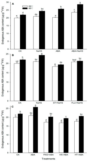 Effect of the irrigation with NaHS and abscisic acid (ABA) alone or in combination (A), NaHS alone or in combination with sodium tungstate (ST) or fluoridone (FLU) (B), and ABA alone or in combination with hydroxylamine (HA) or hypotaurine (HT) (C), on the endogenous ABA content in maize seedlings under non-heat stress (non-HS) and HS conditions. The significance analysis between the data was performed as a one-way analysis of variance (ANOVA) and Duncan multiple-range test at the 0.05 level. The data in the figures represent mean ± standard error (SE, n = 5), the same and different letters indicate the insignificant and significant difference, respectively.