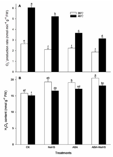 As mentioned above, H2S-ABA crosstalk could activate the activity of the ROS-scavenging system in maize seedlings (Figure 8, Figure 9, Figure 10, Figure 11, Figure 12 and Figure 13). To further explore the effect of H2S-ABA crosstalk on the ROS level in maize seedlings, the H2O2 content and O2.− generation rate was detected. Before the HS, the data show that the generation rate for O2.− in the mesocotyls of the maize seedlings was significantly decreased by the irrigation with NaHS and ABA alone or in combination, but the content of the H2O2 was increased through the irrigations (Figure 14). After the HS, the generation rate for O2.− in the mesocotyls of the maize seedlings was significantly increased, but the HS-induced increase in the generation rate for O2.− was weakened by NaHS and ABA alone or in combination (Figure 14). Also, compared with the control, the H2O2 content in the mesocotyls of the seedlings was maintained at a low level by NaHS and ABA alone, or in combination (Figure 14).