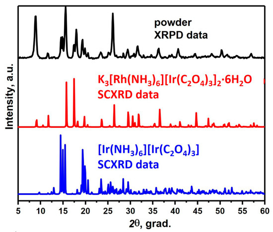 The comparison of XRPD patterns of the obtained two-phase mixture with monocrystalline data for [Ir(NH3)6][Ir(C2O4)3] and K3[Rh(NH3)6][Rh(C2O4)3]2∙6H2O.
