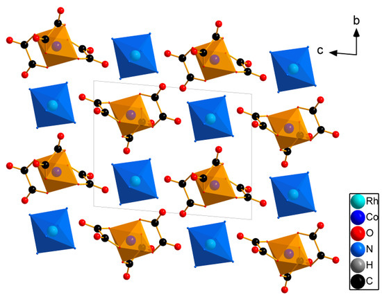 - Khranenko, S.P.; Bykova, E.A.; Alexeyev, A.V.; Tyutyunnik, A.P.; Gromilov, S.A. Complex salts with participation of [Rh(NH3)6]3+ cations. J. Struct. Chem. 2012, 53, 521–526. [Google Scholar]